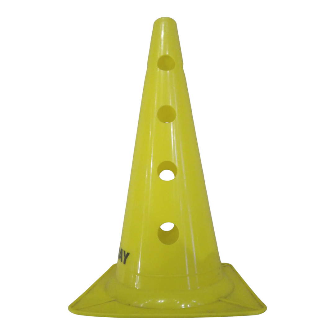 Тренувальний конус з отворами має висоту 38 см і контрастне забарвлення, що дає змогу бачити його з великої відстані. Під час побудови змагальних трас або розмітки ігрових майданчиків виникає необхідність використовувати такі пристосування. Вони не потребують спеціального кріплення, мають стійкі основи та підходять для встановлення на будь-який тип покриття. За наявності спеціальних поперечок за допомогою двох конусів можна зробити бар’єр для бігу. У конструкції є отвори, розташовані на різній висоті, що дає змогу не тільки встановити бар’єр, а й вибрати висоту його розташування залежно від рівня підготовки спортсмена і вимог тренування.