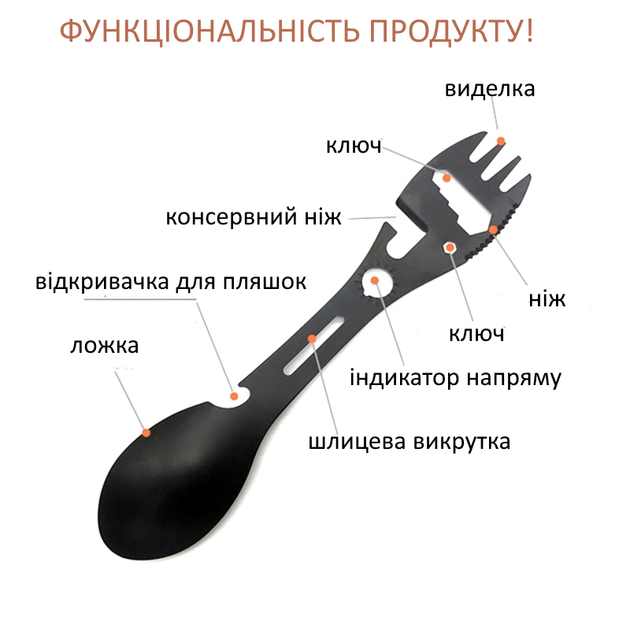 Туристичний мультитул 5-в-1: Ложка-вилка з додатковими функціями. Цей універсальний тактичний мультитул — ідеальне рішення для тих, хто прагне максимально полегшити своє спорядження без втрати функціональності. Один компактний інструмент замінює цілий набір столового приладдя та базових інструментів, що робить його незамінним для туристів, виживальників та любителів пікніків.