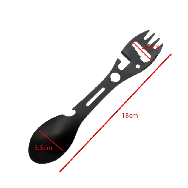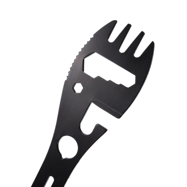 Багатофункціональність 5-в-1: Прилад поєднує в собі повноцінну ложку, вилку, відкривачку для пляшок, консервний ніж та три позиції шестигранних ключів