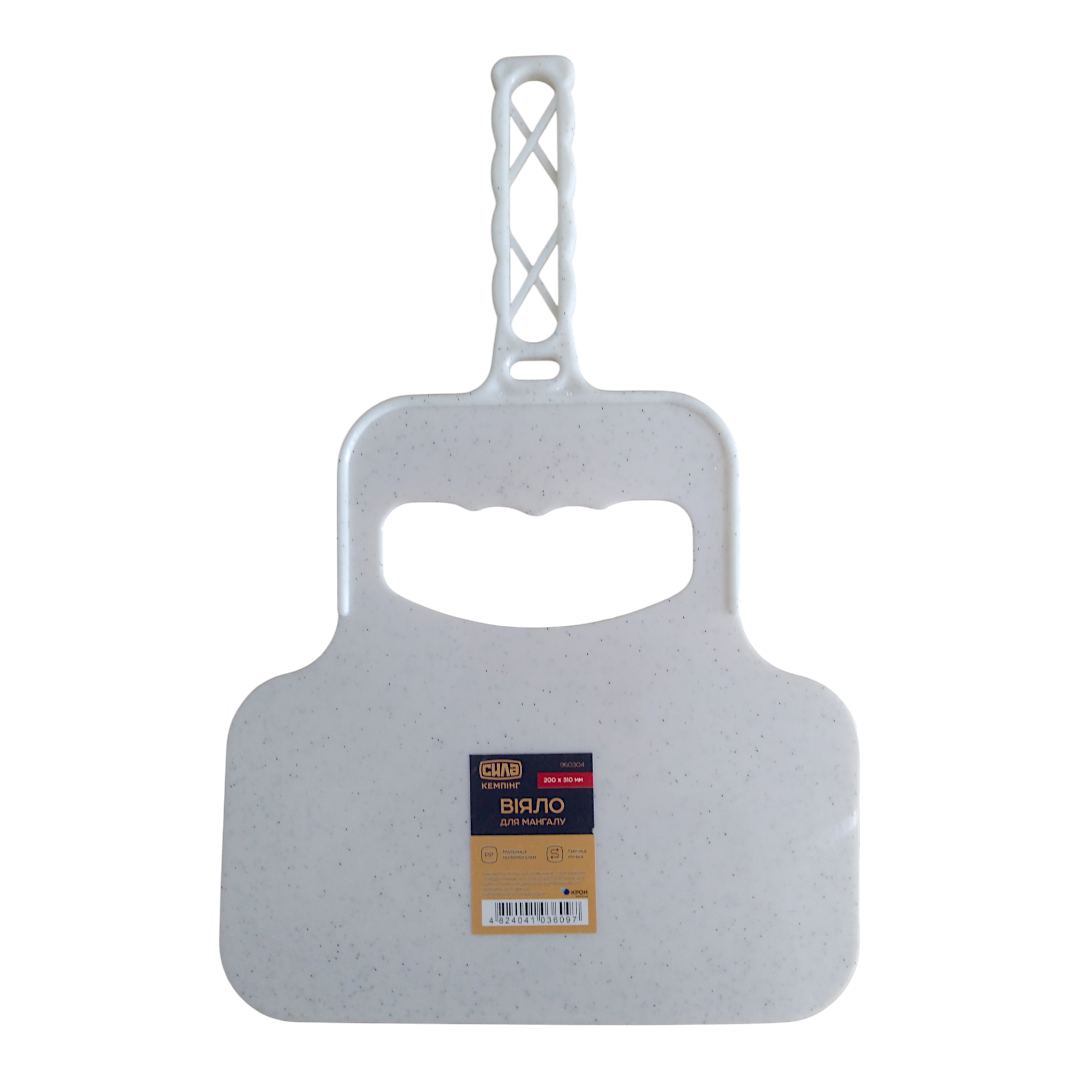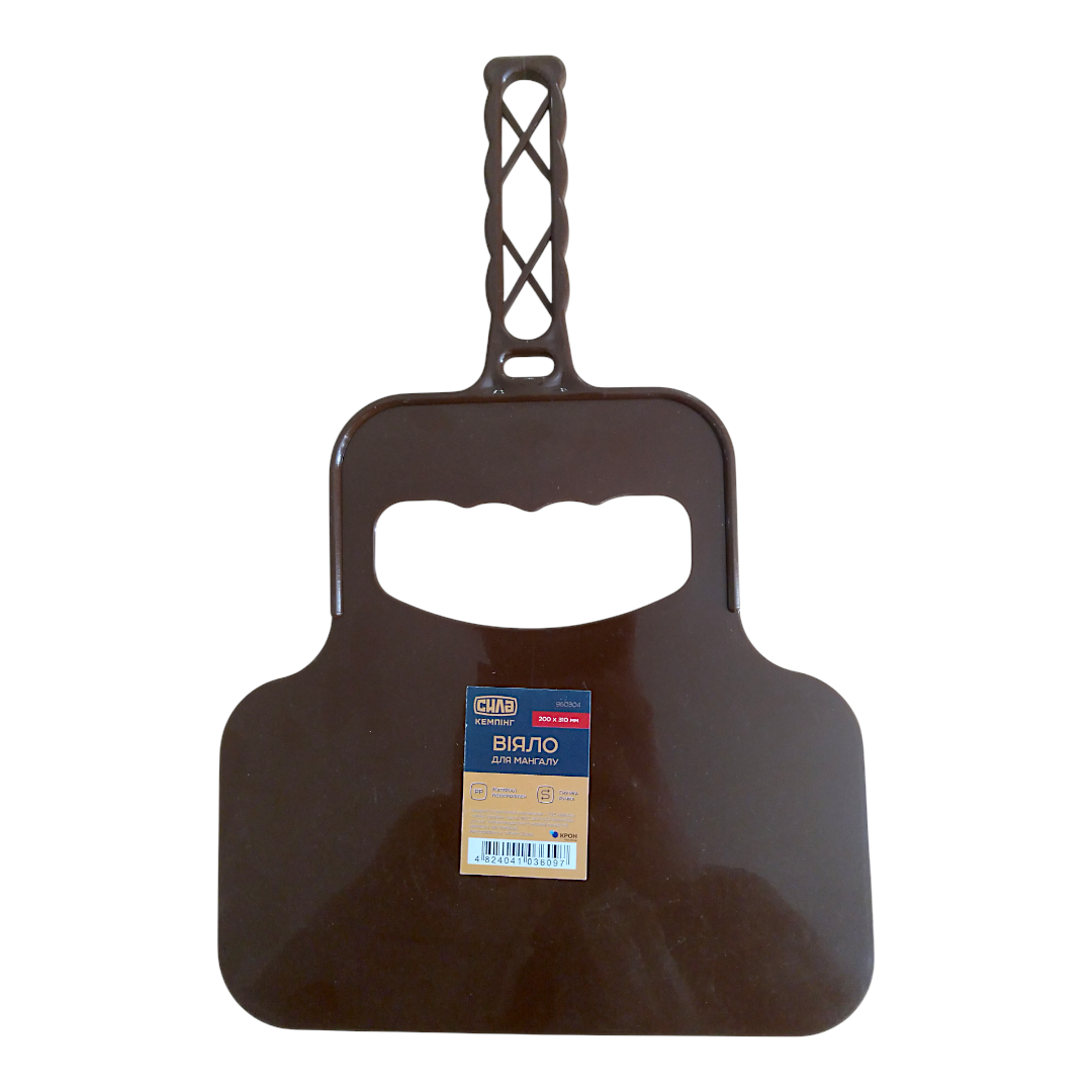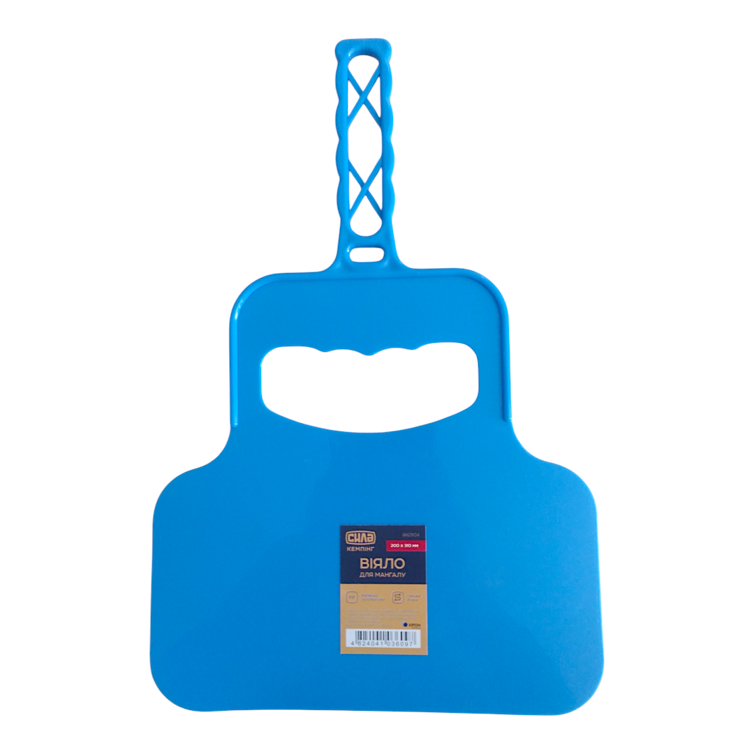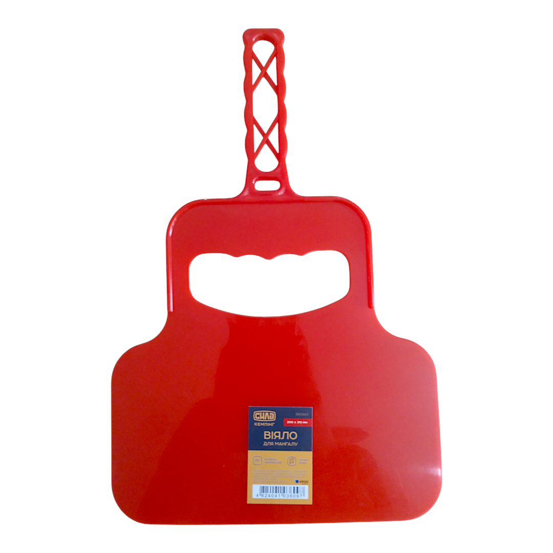 Це простий, але ефективний аксесуар для розпалювання мангалу чи барбекю — пластикове віяло-махало від бренду СИЛА розміром 200×310 мм. Основна функція: створювати потік повітря, що стимулює тління вугілля чи дров, допомагає швидше розгоріти багаття.