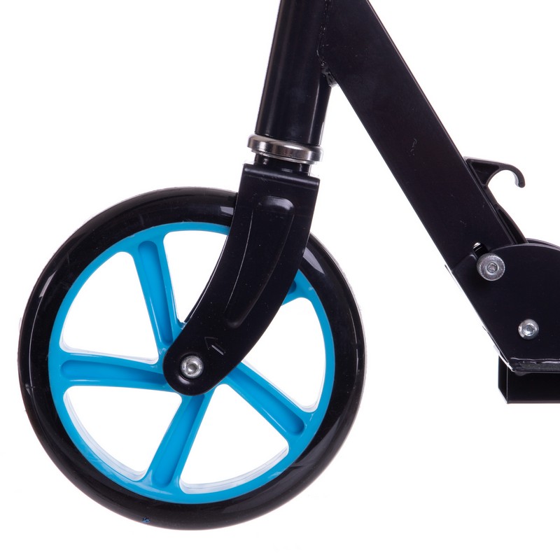Колеса виконані з поліуретану. Вони м’які, безкамерні та дуже надійні у використанні. Платформа має протиковзне покриття для кращої стійкості. Самокат приводиться в рух ногою, а знизити швидкість або швидко зупинитися дозволяє заднє ножне гальмо. Кермо можна відрегулювати по висоті, на руків’ях розташовані зручні грипси, що забезпечують надійний хват. Кожен елемент конструкції розрахований на довговічність і комфорт у використанні.