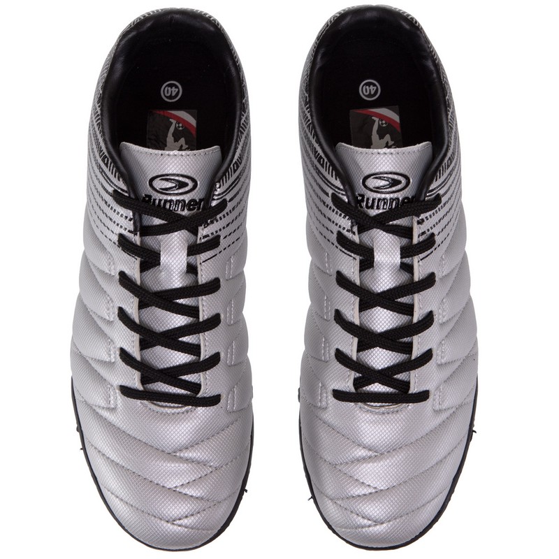 Сороканіжки RUNNER H1RF2007E-1 – стильні та практичні сороконіжки, які можна використовувати для гри в футбол на ґрунтовому полі та ковроліні. Верх сороконіжок виконаний з поліуретану і забезпечує відмінне зчеплення з поверхнею м’яча, дозволяючи добре контролювати його. Поліуретановий верх, попри високу міцність і стійкість до впливу вологи, відрізняється легкістю і не обтяжує взуття. Він приймає обриси стопи і щільно її облягає. Взуття служить продовженням ніг футболіста і дозволяє зберігати колишню швидкість і маневреність. Стійкість на різних покриттях гарантує якісна гумова підошва з невеликими шипами. Напрямок і розташування шипів обрані не випадково, вони дозволяють отримати максимальну стійкість при виконанні поворотів, прискорень та інших маневрів.